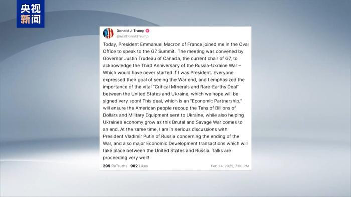 美国总统特朗普24日表示,可能在数周内结束俄乌冲突。他正在与俄罗斯总统普京就结束俄乌冲突以及美俄经济发展合作进行讨论,谈判进展顺利。特朗普当天称,俄罗斯有美国需要的资源,比如稀土,美国正努力与俄罗斯合作促进经济发展,他愿在适当的时间访问俄罗斯。
